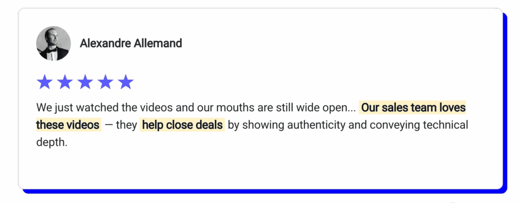 We capture insights from your teams and customers in remote interviews, and produce immersive stories that directly support Sales, Marketing, Customer Success, and Product.