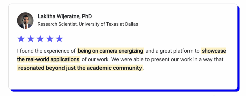 No prep required. Just show up for a relaxed, 1:1 conversation and we capture studio-grade video and audio